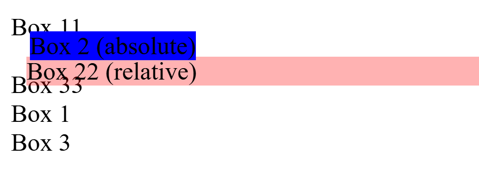 - absolute: Box 2가 사라진 것처럼 되어 Box 1과 Box 3가 붙어버림